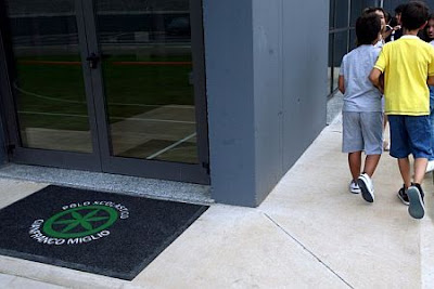 There is a school in the little town of Adro, in the province of Brescia, that is named after Gianfranco Miglio – the late ideologue and racist theorist of the Northern League – and that is literally covered with symbols of the party, chiefly in the form of the green 'sun of the Alps' you see in the picture above. If you exclude the notoriously intractable problem of how to remove crucifixes from some of our classrooms (at Adro, they bolted them into the walls for good measure), not since Fascism had a public school been such an overt instrument of propaganda. And the local populace is divided on this, but largely in favour. Don’t we have a right to our symbols, ask some? And besides it would be too expensive to remove them, explains the principal, because they are literally everywhere: on the doors, on the windows, even on the garbage bins.
